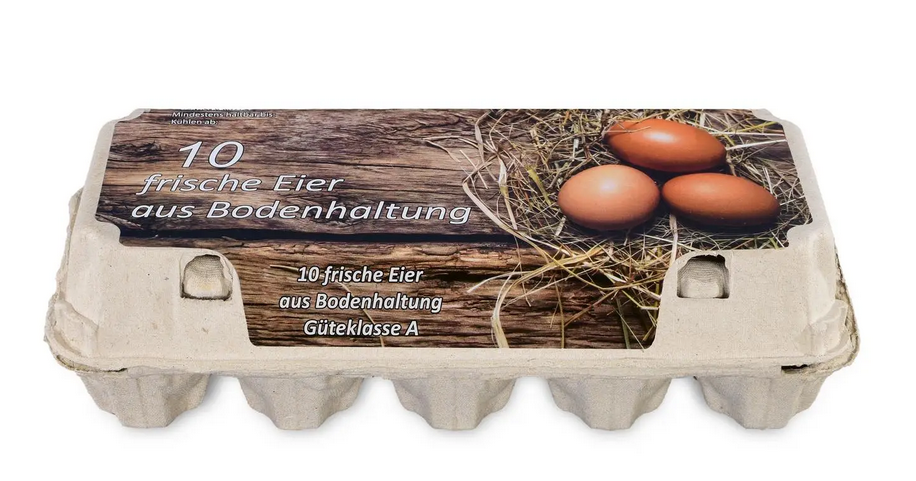 - 10er Eierschachteln mit mehrfarbig vorgedrucktem Etikett "Bodenhaltung"