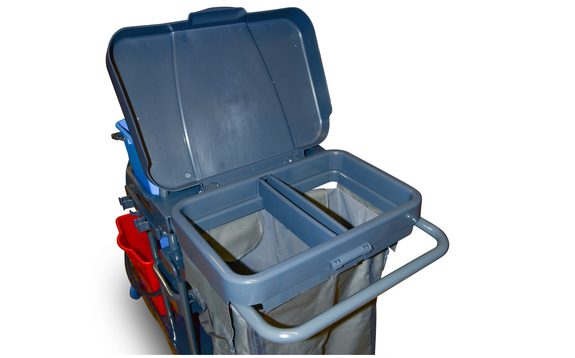 Profi-Reinigungswagen mit 6 Eimern, davon 4 x à 5 Liter im 4-Farb-Reinigungssystem rot, grün, blau und gelb und 2 Eimer mit je 18 Liter Fassungsvermögen in rot und blau mit innen liegender Liter-Skala. Aufsetzbare Mopp-Presse, seitliche Halterung für Wischmopp- oder Besenstiel und Ablage für Mopp und Besen, sehr großer Utensilbehälter, 100 l Leinensack mit Reissverschlüssen, nutzbar z.B. in der gesamten Breite für Wäsche aus der Reinigung von Hotelzimmern oder getrennt mit 2 Müllsäcken als Abfallsammler.