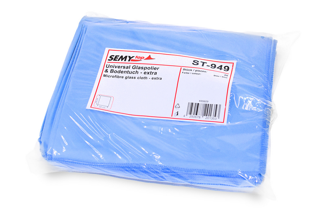 Semy-Top Universal Glaspolier- und Bodentuch sorgt mit seiner feinen Mikrostruktur für eine saubere und streifenfreie Reinigung bei Oberflächen, Gläsern und Böden. Es ist ideal für viele Einsatzarten feine, saugstarke Oberfläche gekettelte Umrandung, geschützte Kanten trocken und nebelfeucht verwendbar. für viele weitere Anwendungen geeignet, wie z.B. in der Gebäudereinigung und der Fahrzeugpflege. Es besteht aus 80 % Polyester und 20 % Polyamid. Am effektivsten sind die Mikrofasertücher entweder trocken oder höchstens nebelfeucht, da sie in diesem Zustand die meisten Schmutzpartikel aufsaugen können.
