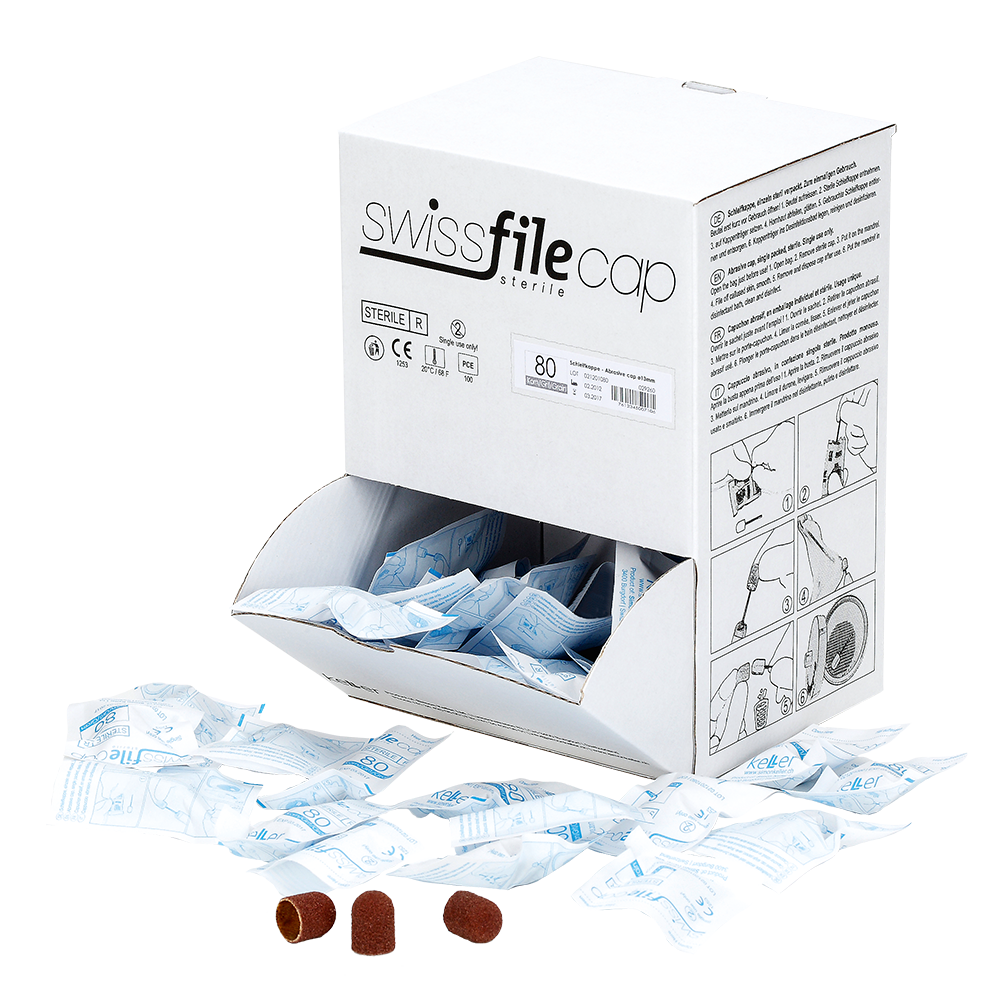 Für alle, die gerne mit Schleifkappen arbeiten und auch in diesem Bereich steril aufbereitete Instrumente verwenden möchten, gibt es die SwissFileCaps. Sie sind einzeln steril verpackt. Zur Verfügung stehen drei Größen (5, 10 und 13 mm Ø) in mittelgrober Körnung jeweils im praktischen Dispenser à 100 Stück. Dazu passend gibt es die entsprechenden Kappenträger, die problemlos im Ultraschallbad desinfiziert und bei max. 121°C (Schonprogramm für thermolabile Instrumente) im